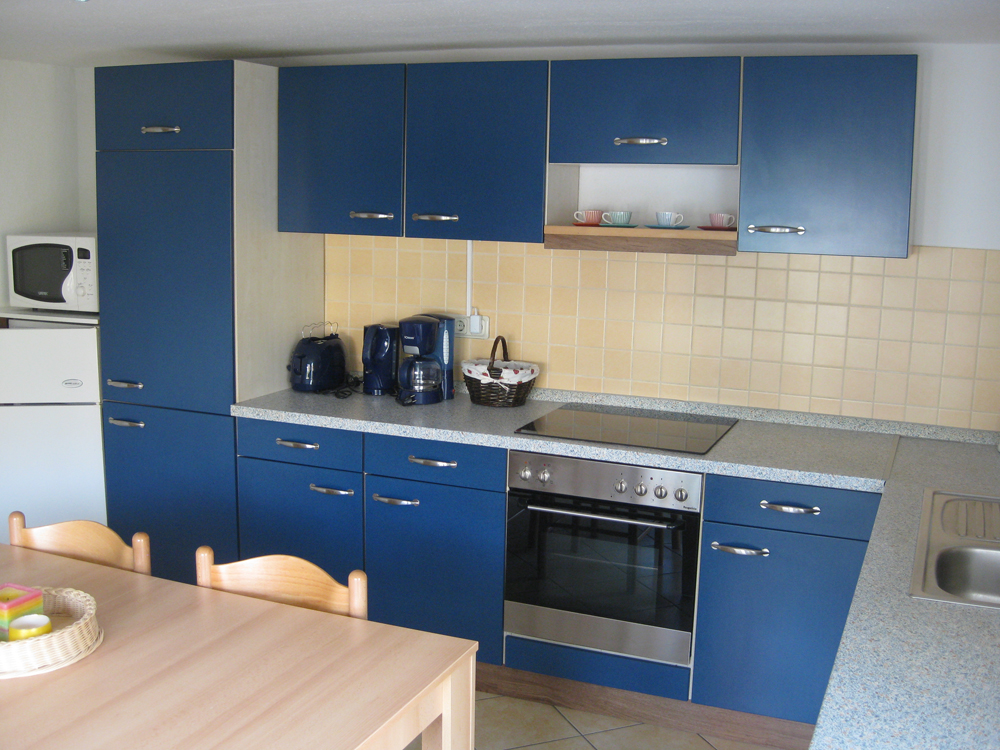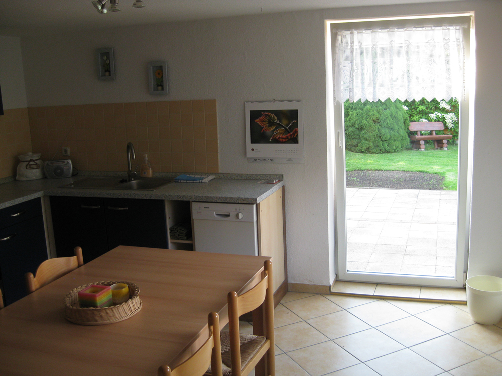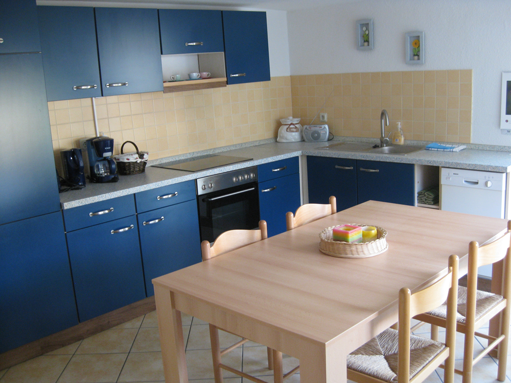 Die große Küche bietet neben der normalen Ausstattung wie Herd, Kühlgefrierkombination ,Kaffeemaschine , Toaster usw. auch einen Geschirrspüler und eine Mikrowelle .Außerdem bietet sie einen direkten Zugang zur angrenzenden Terrasse mit Gartenmöbel und Grill.